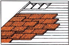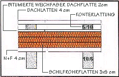 z.B. einfache Dachkonstruktionen, unten sichtbare Sparren, Untersichtschaltung, darauf dampfdurchlässiges Papier (Perkalor oder BI-Natur), dann 3-5 Lagen Stero-Schilfrohrplatten 5 cm stark, ohne Zwischenhölzer. Darüber als Unterdachschutzbahn nochmals eine Lage armiertes Papier (wie oben). Als Konterlatten werden Bretter mit ca. 10-15 cm Breite aufgebracht und an der Firsttraufe befestigt.
