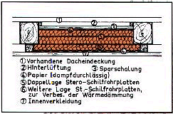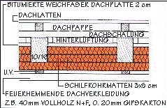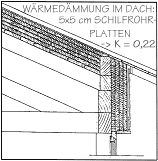 Auf dem Hallendach werden Stero-Schilfrohrplatten in 5 Lagen großflächig verlegt. Die Holzkonstruktion des Dachstuhls bleibt innen sichtbar. Die Dacheindeckung wird mittels Auflagehölzer auf die Stero-Schilfrohrplatten aufgelegt. (Die Platten sind ausreichend druckfest.)